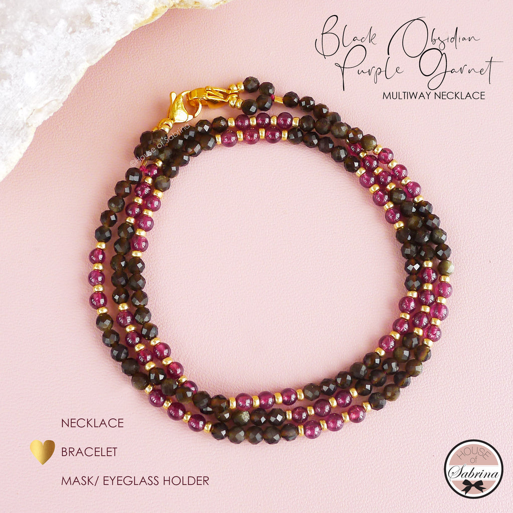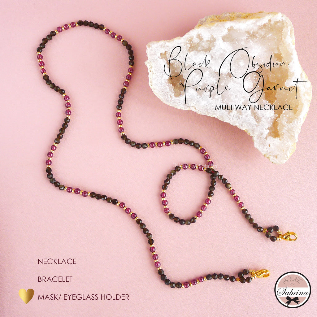 BLACK OBSIDIAN AND PURPLE GARNET MULTIWAY NECKLACE, BRACELET, MASK LANYARD, EYEGLASSES HOLDER